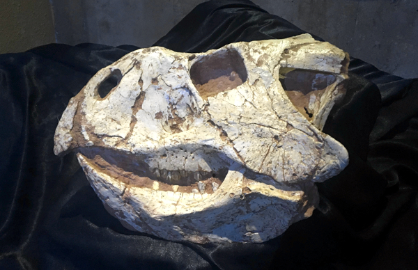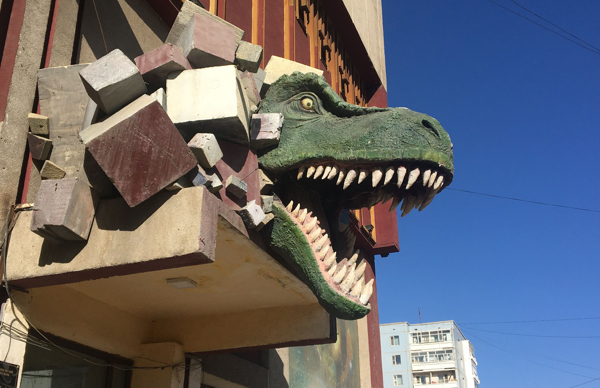 Dinosaur crashing through the wall at the Central Museum of Mongolian Dinosaurs