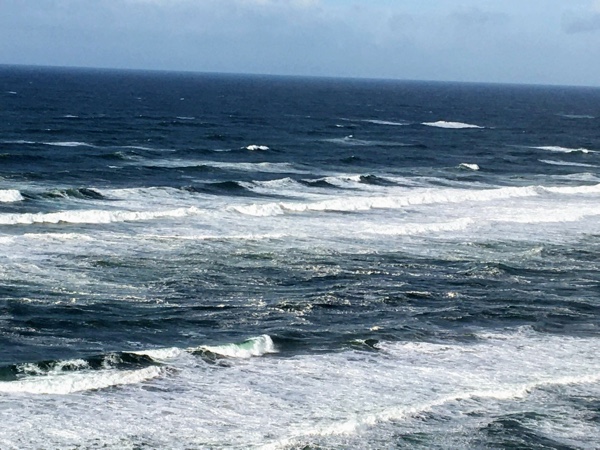 White-capped waves contrast starkly against the deep blue Pacific Ocean off North Head Lighthouse